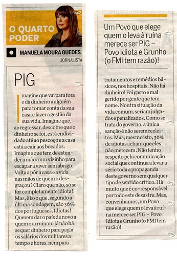 ORecebis verdadeiros socialistas deviam ponderar bem o seu voto nas próximas eleições e aproveitarem para mandarem o pacóvio para a terra assinar projectos de barracas. Uma certeza podem ter, acabaram-se os tachos porque já acabou o caroço, gastaram-no até aos próximos 40 anos. Este Primeiro-Ministro não tem competência, não tem carácter, não tem palavra. É um falso engenheiro pacóvio mentiroso compulsivo Só tem temperamento di capo. Desgovernou com mentiras sucessivas, a cavalo da propaganda paga com o nosso dinheiro bem com a Imprensa paga que tanto o apoia, como um produto obsoleto do séc. XX. Atacou, um a um, todos os pilares do Estado de Direito: a independência dos tribunais, a liberdade de imprensa, a separação de poderes, o respeito institucional. Instalou-se no poder espalhando o seu séquito de Varas, Penedos e Ruis Pedros Soares, dos Silvas (Santos e Pereira). Afundou 40 anos do nosso futuro em parcerias público-privadas com consórcios e empresas onde pululam milhares de amigos e ex-ministros socialistas com vencimentos obscenos. Passou o mandato de buraco em buraco, sempre a tentar tapar e sempre a tentar esconder, sem estratégia de crescimento ou projecto de país. E deixou-nos na banca rota oculta. Oculta, sim. Porque tudo no país está mais oculto e opaco, porque os números do Governo já não são fiáveis como vai acontecer com a revisão do défice de 2010. Como se está a descobrir, no que é só o princípio de um buraco que, se descoberto, será maior, e que o Presidente e os partidos pretendem ocultar para evitar males maiores. Esse altíssimo preço da perda global de credibilidade e soberania - é o que já estamos a pagar e vamos pagar mais ainda. E sai, falso ofendido, com um discurso de vitimização, a acusar os outros da crise que ele próprio criou, urdiu e que nos levou à bancarrota. Votem em quem quiserem mas nunca votem em Sócrates. É demasiado mau, sai demasiado caro. E acrescento que estes indivíduos deveriam ser presos, julgados criminalmente e condenados por tanta ofensa e tanta aldrabice em que envolveram o País. E o mesmo se deverá aplicar a outro/s próximo/s governo/s.